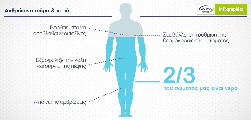 Τα 2/3 του σώματός μας είναι νερό. Αυτό το στοιχείο και μόνον αποδεικνύει πόσο ζωτικής σημασίας είναι η τακτική κατανάλωση νερού για τον άνθρωπο. Πέραν της ίδιας της επιβίωσής μας, το νερό - μεταξύ άλλων - εξασφαλίζει τη σωστή λειτουργία των αρθρώσεων, κάνει καλό στο δέρμα, βοηθά στα προβλήματα χώνεψης, και φροντίζει τη σιλουέτα μας. Ο οργανισμός μας χρειάζεται τουλάχιστον ένα λίτρο νερό την ημέρα, ποσότητα που δεν αντικαθίσταται από άλλα υγρά.